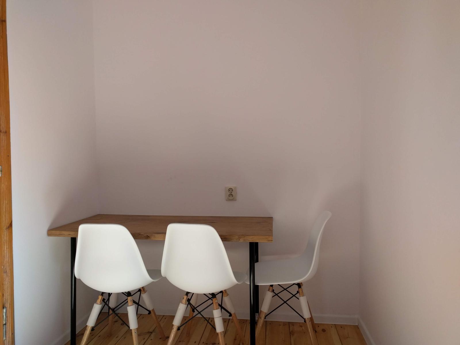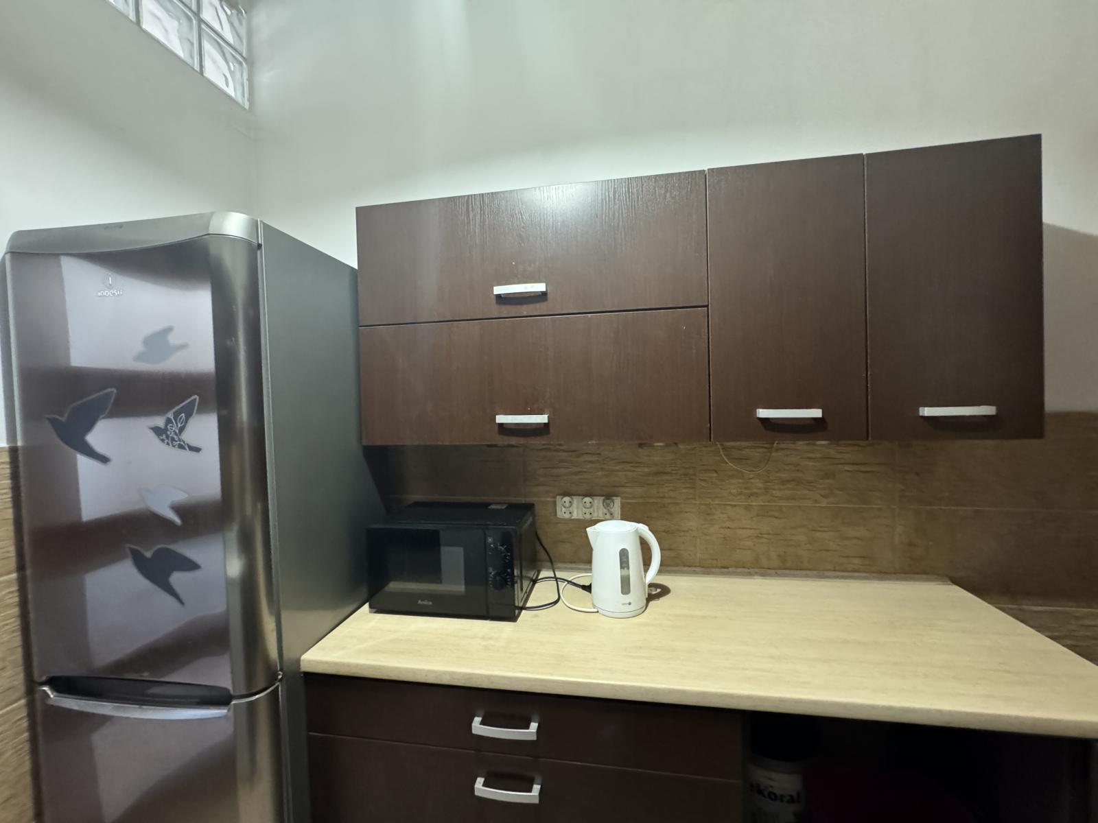 W mieszkaniu jest w pełni wyposażona kuchnia - w tym kuchenka, lodówka, pralka, czajnik, mikrofala, naczynia, odkurzacz. Do tego łazienka oraz mała jadalnia.